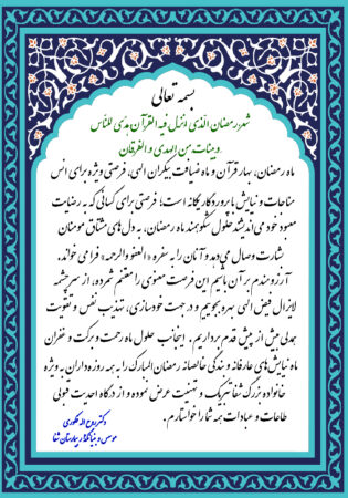 ماه رمضان، بهار قرآن و ماه ضیافت بیکران الهی، فرصتی ویژه برای انس، مناجات و نیایش با پروردگار یگانه است؛ فرصتی برای کسانی که به رضایت معبود خود میاندیشند.حلول شکوهمند ماه رمضان، به دلهای مشتاق مومنان، بشارت وصال میدهد و آنان را به سفره «العفو والرحمه» فرا می خواند. آرزومندم بر آن باشیم این فرصت معنوی را مغتنم شمرده، از سرچشمه لایزال فیض الهی بهره بجوییم و در جهت خودسازی، تهذیب نفس و تقویت روح برادری و همدلی بیش از پیش قدم برداریم.